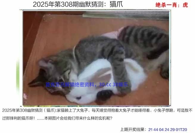 2025年第308期幽默猜测(猫爪):家猫赖上了大兔子,每天睡觉得抱着大兔子才能睡得着,小兔子想跑,可是敌不过那锋利的猫爪呀!..本期图片会给我们带来什么样的玄机呢? 综合特肖:虎龙鼠鸡兔牛 幽默猜测综合推荐:绿蓝+大数 |